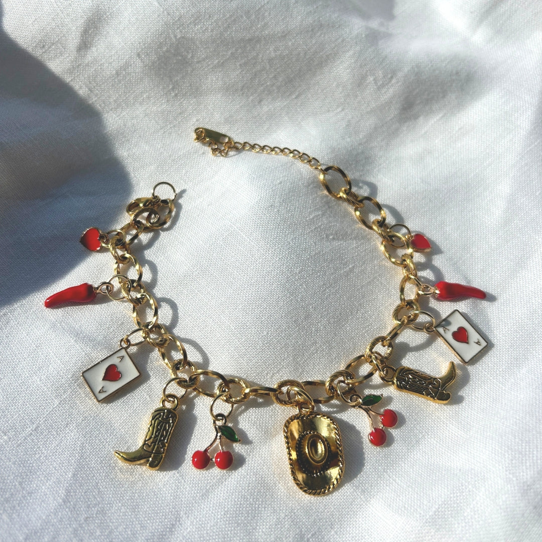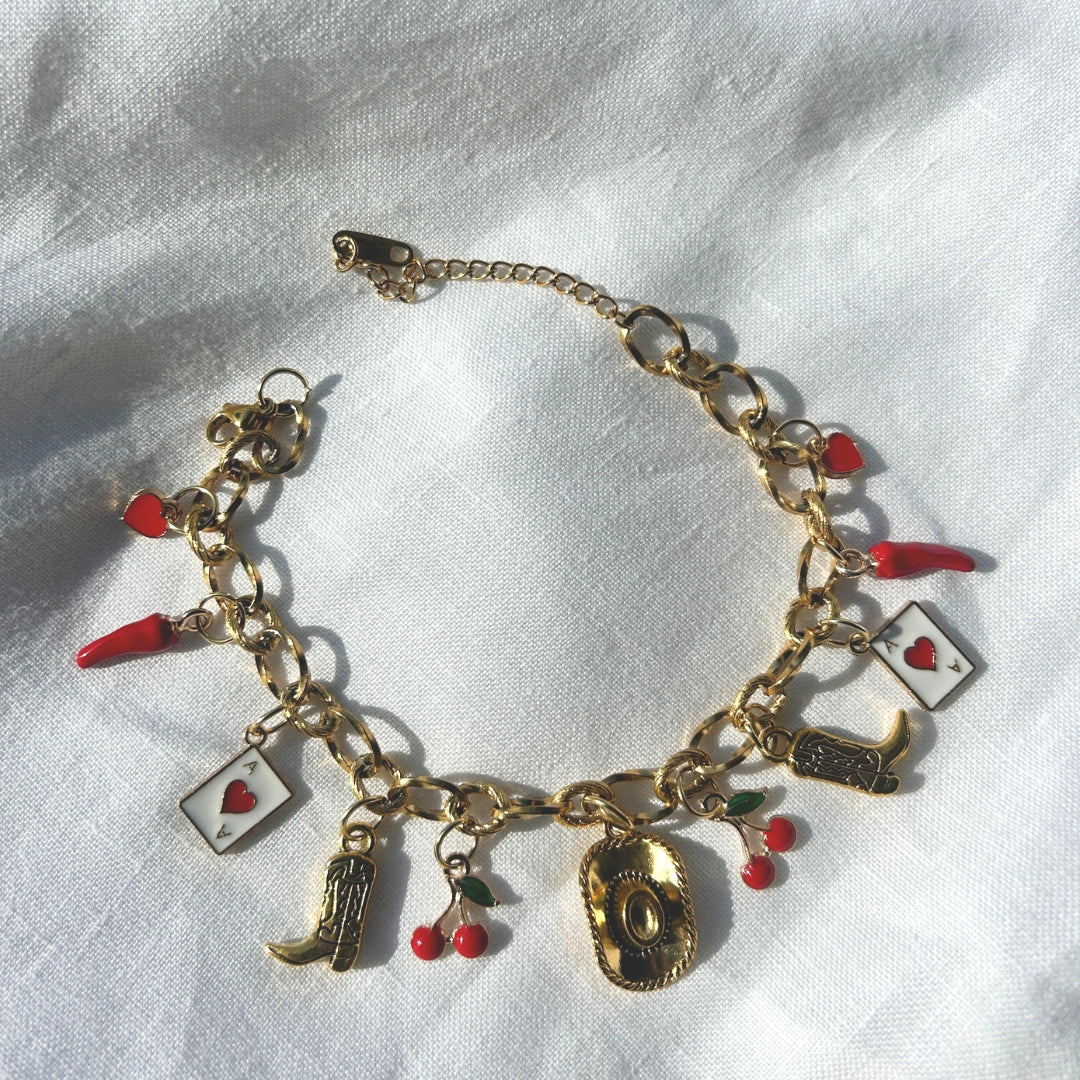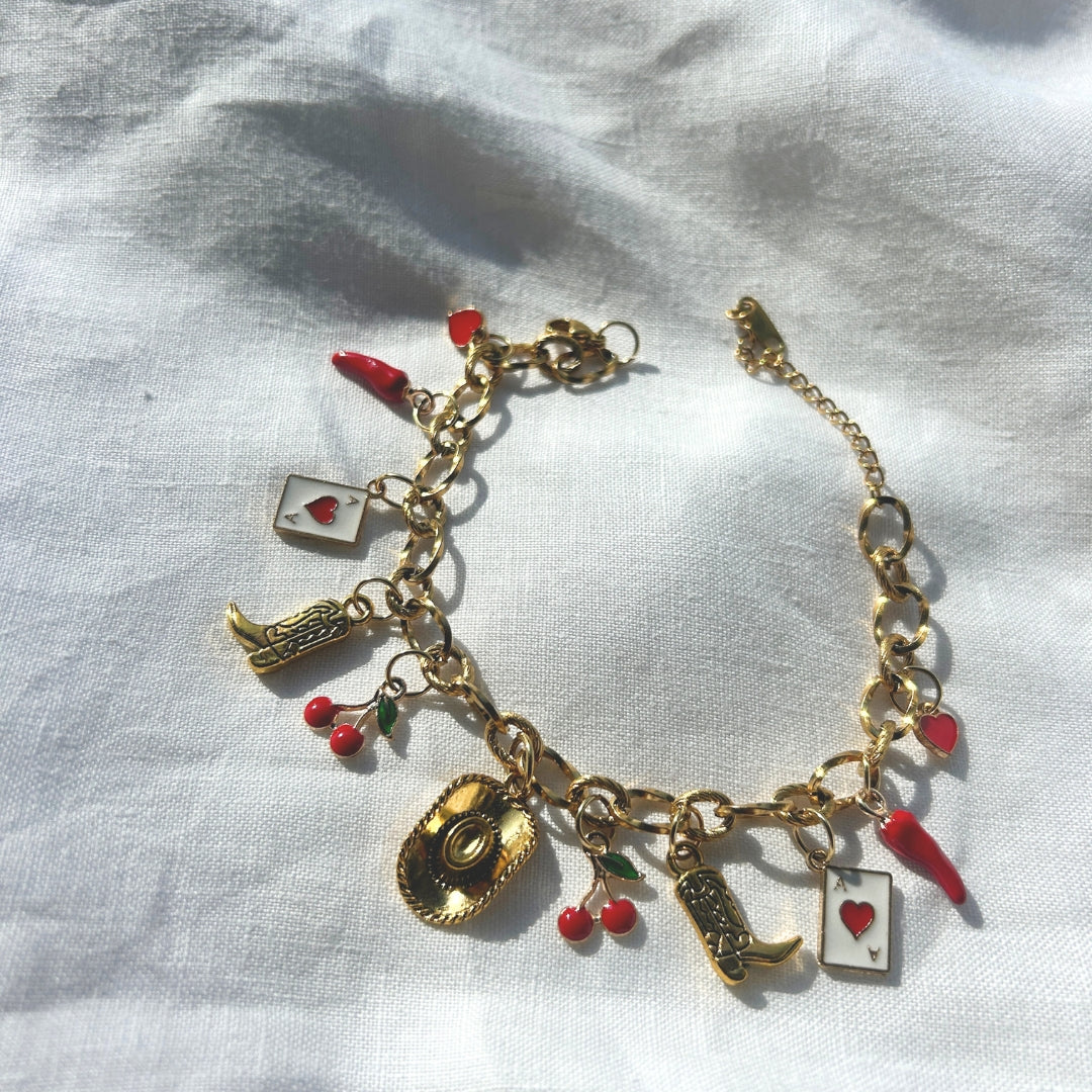 The "Cute but Spicy" charm bracelet features 11 unique charms, including cherries, fiery chilli peppers, cowboy boots and hats, and adorable red hearts. This playful mix of charms adds a fun and flirty touch to any outfit!