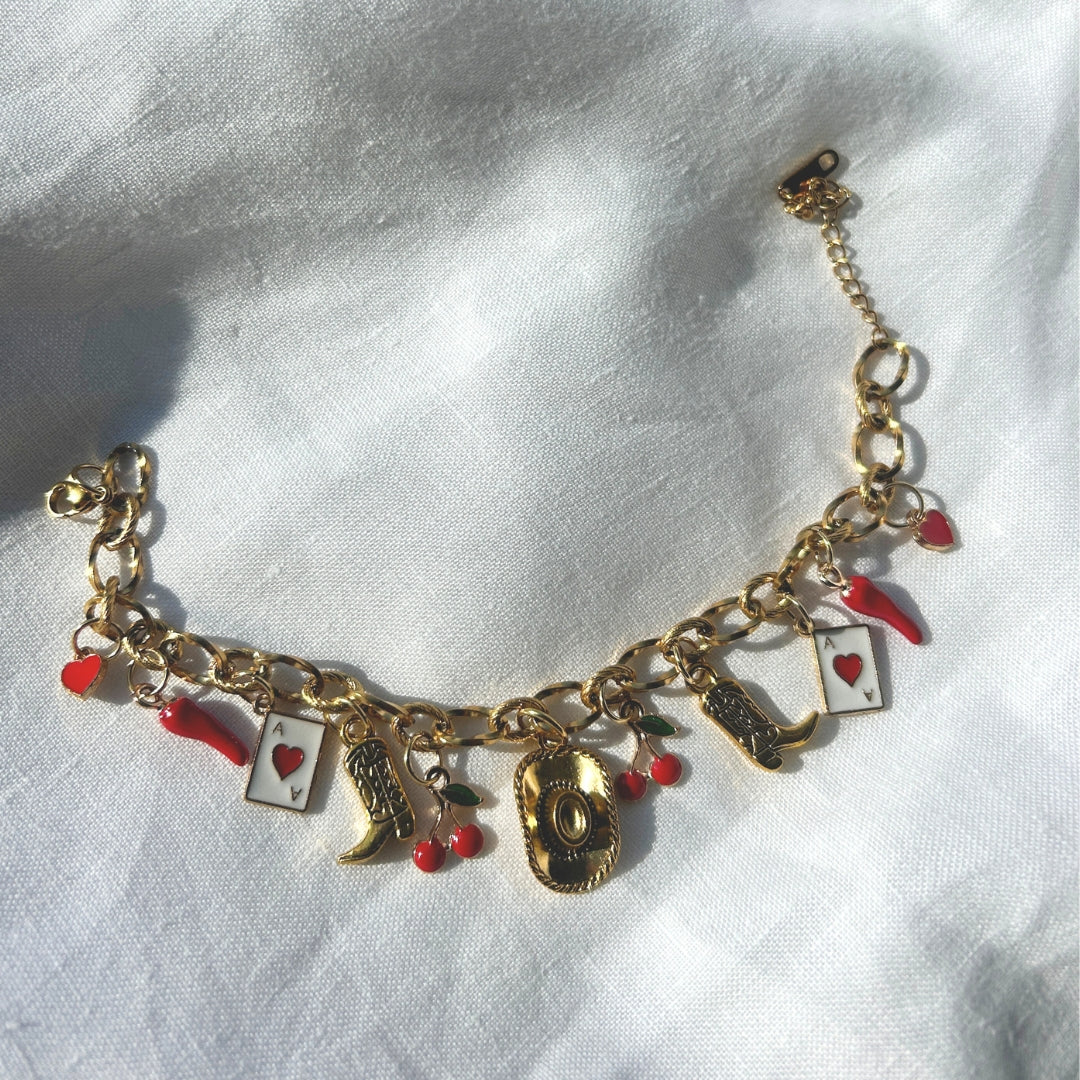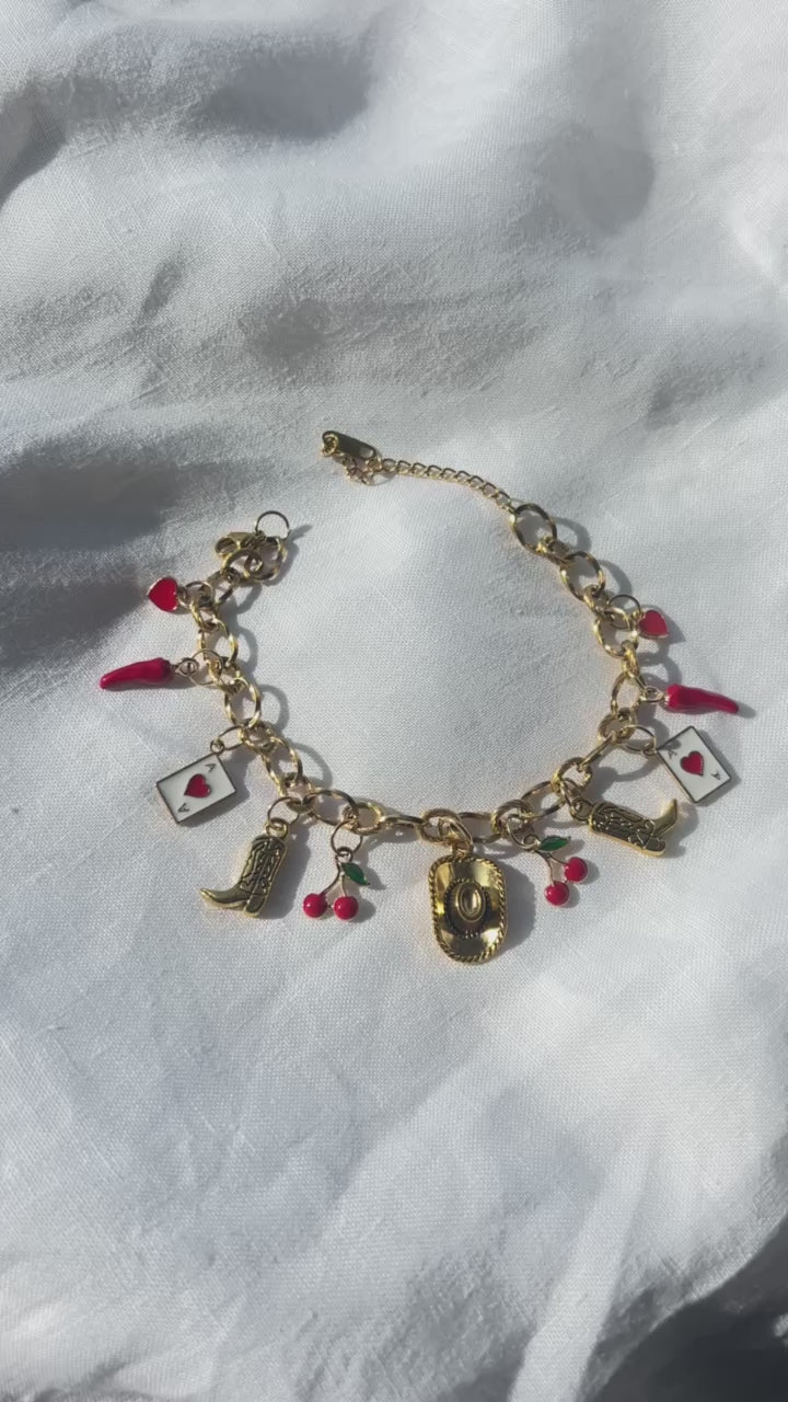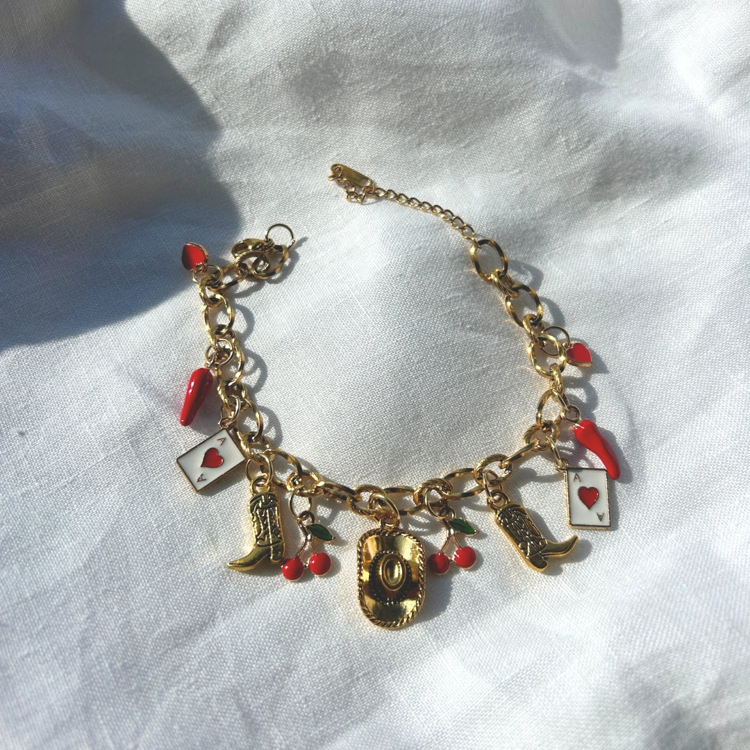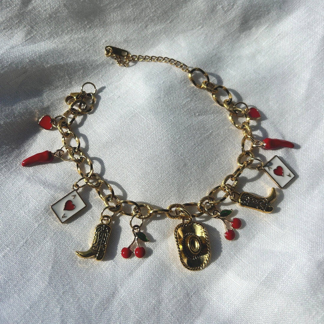 The "Cute but Spicy" charm bracelet features 11 unique charms, including cherries, fiery chilli peppers, cowboy boots and hats, and adorable red hearts. This playful mix of charms adds a fun and flirty touch to any outfit!