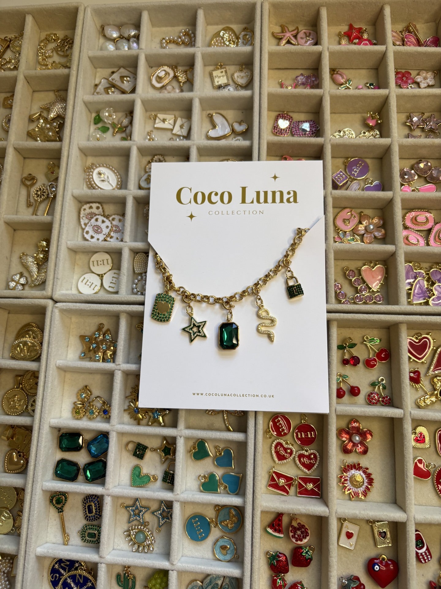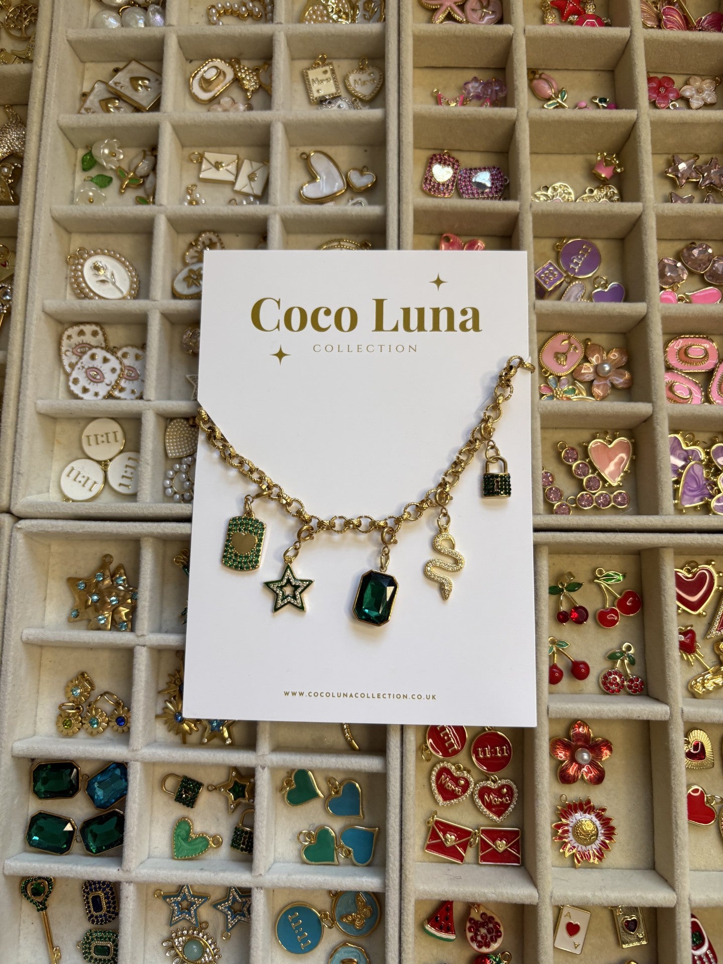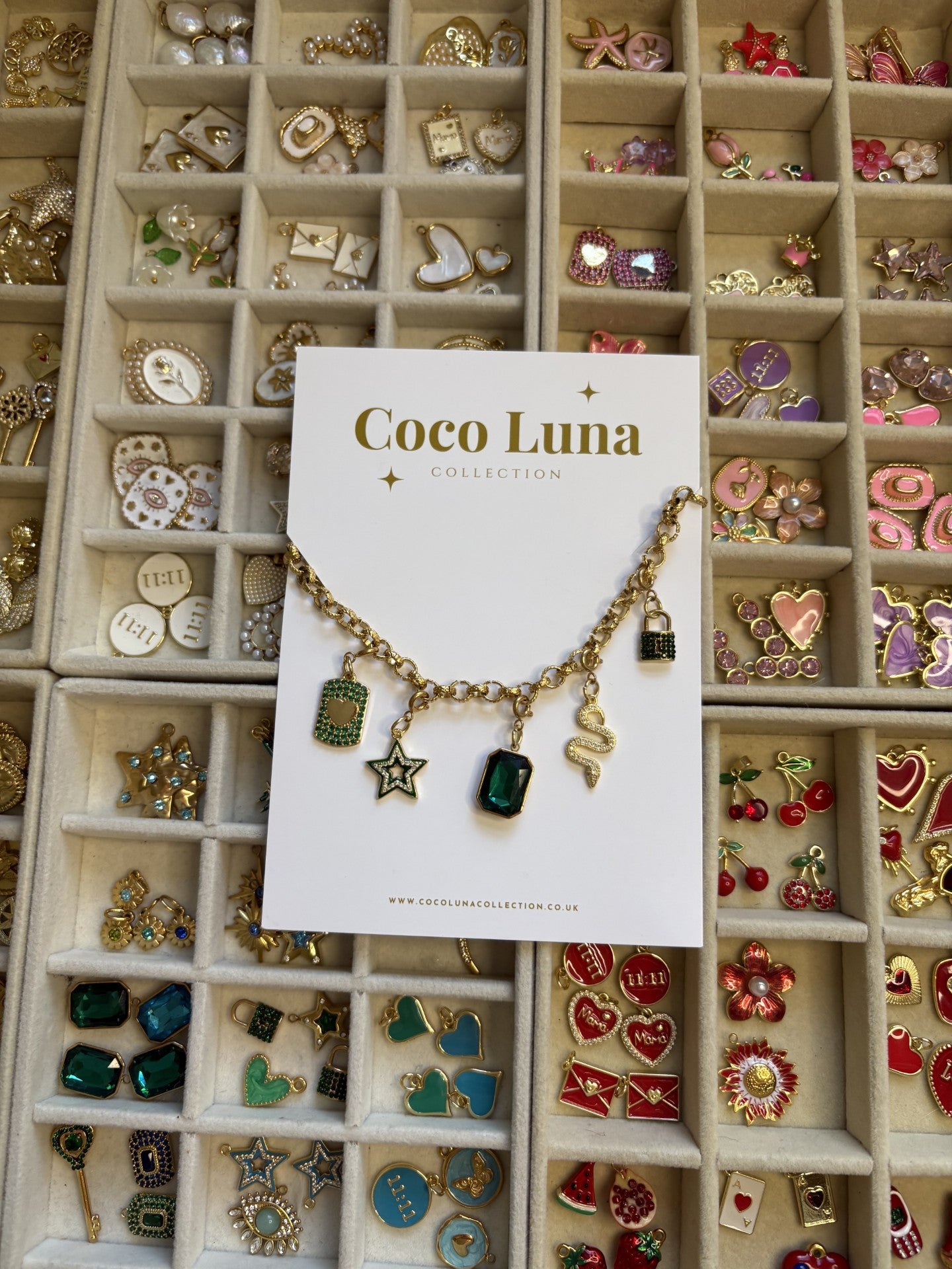 A collection of charm necklaces and bracelets ready to wear. These exclusive designs make choosing charms easy, especially when faced with over 500 options.