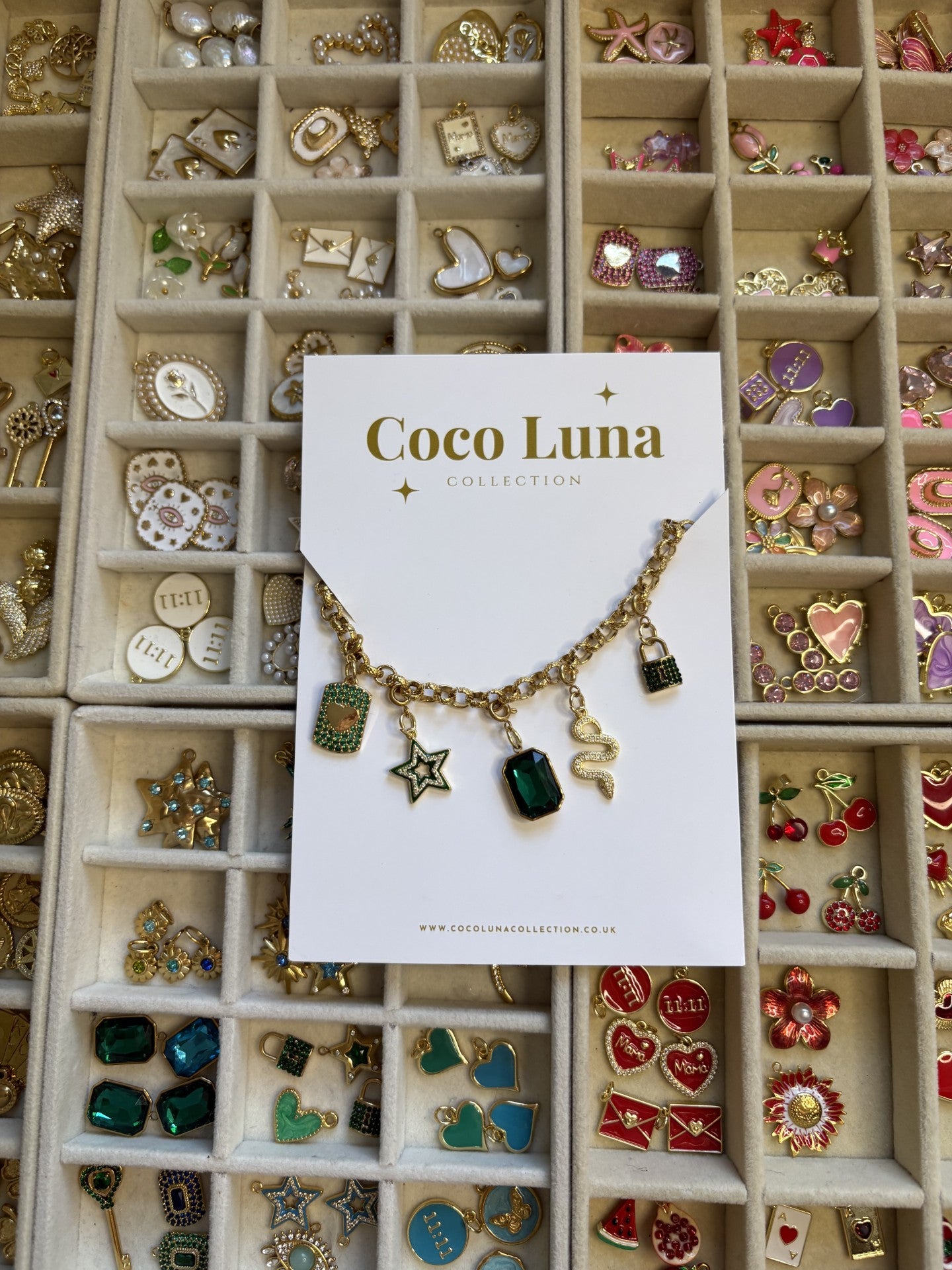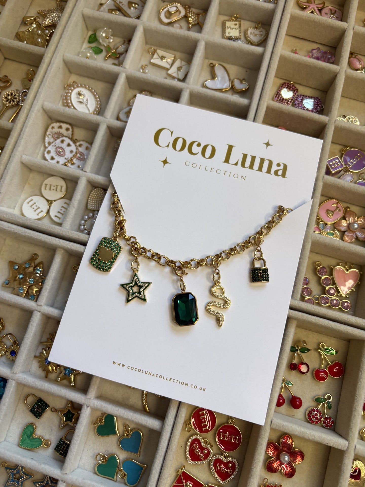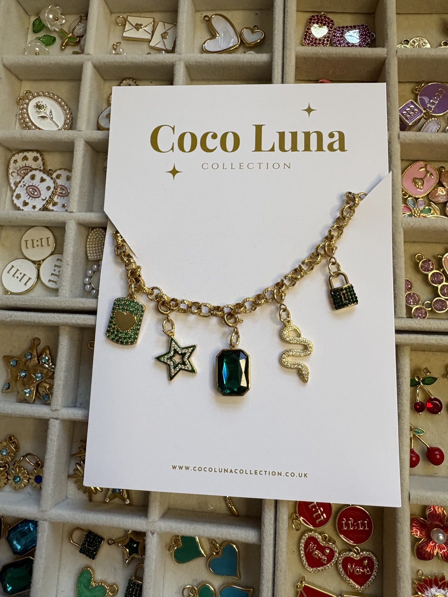 A collection of charm necklaces and bracelets ready to wear. These exclusive designs make choosing charms easy, especially when faced with over 500 options.