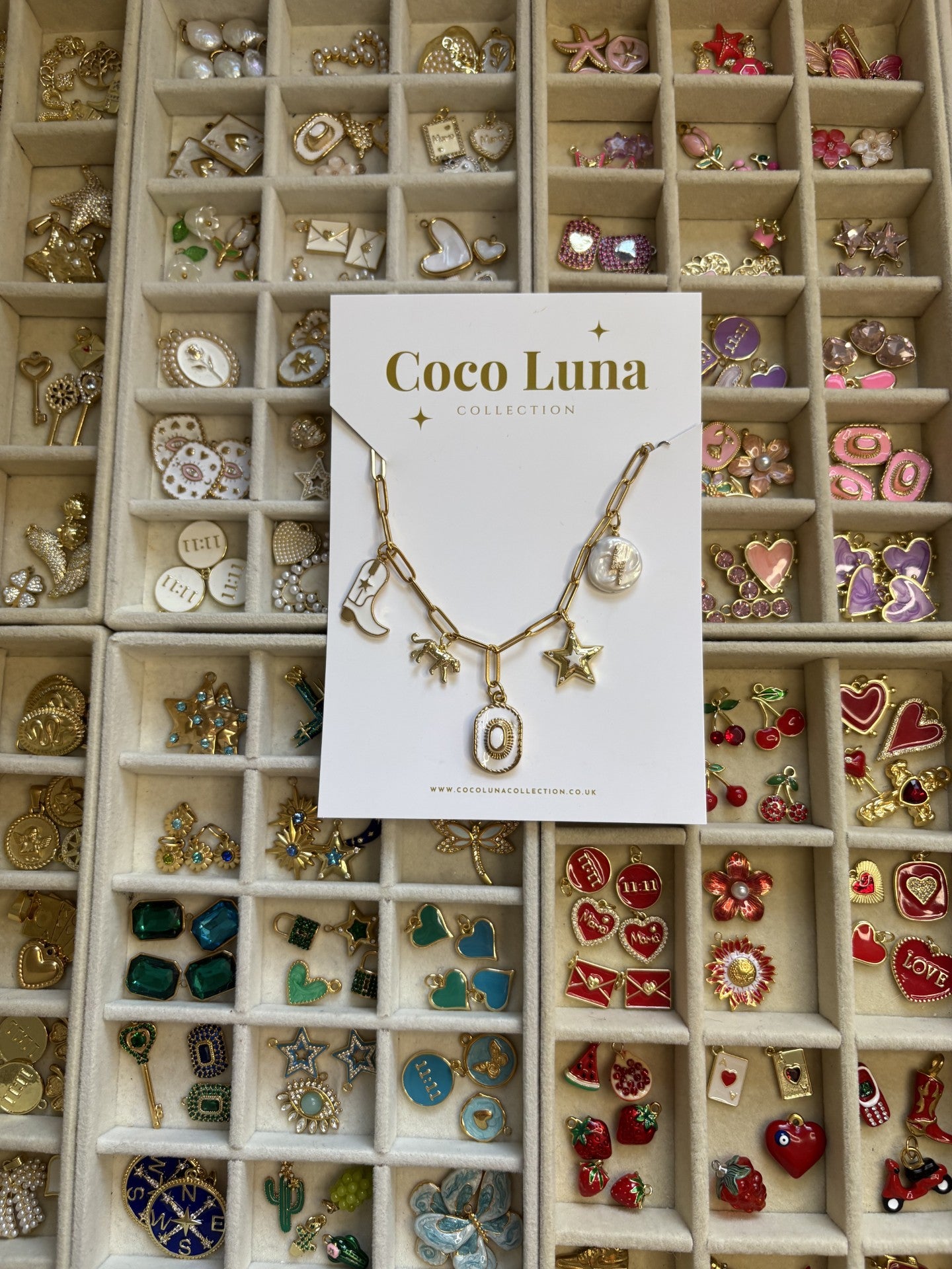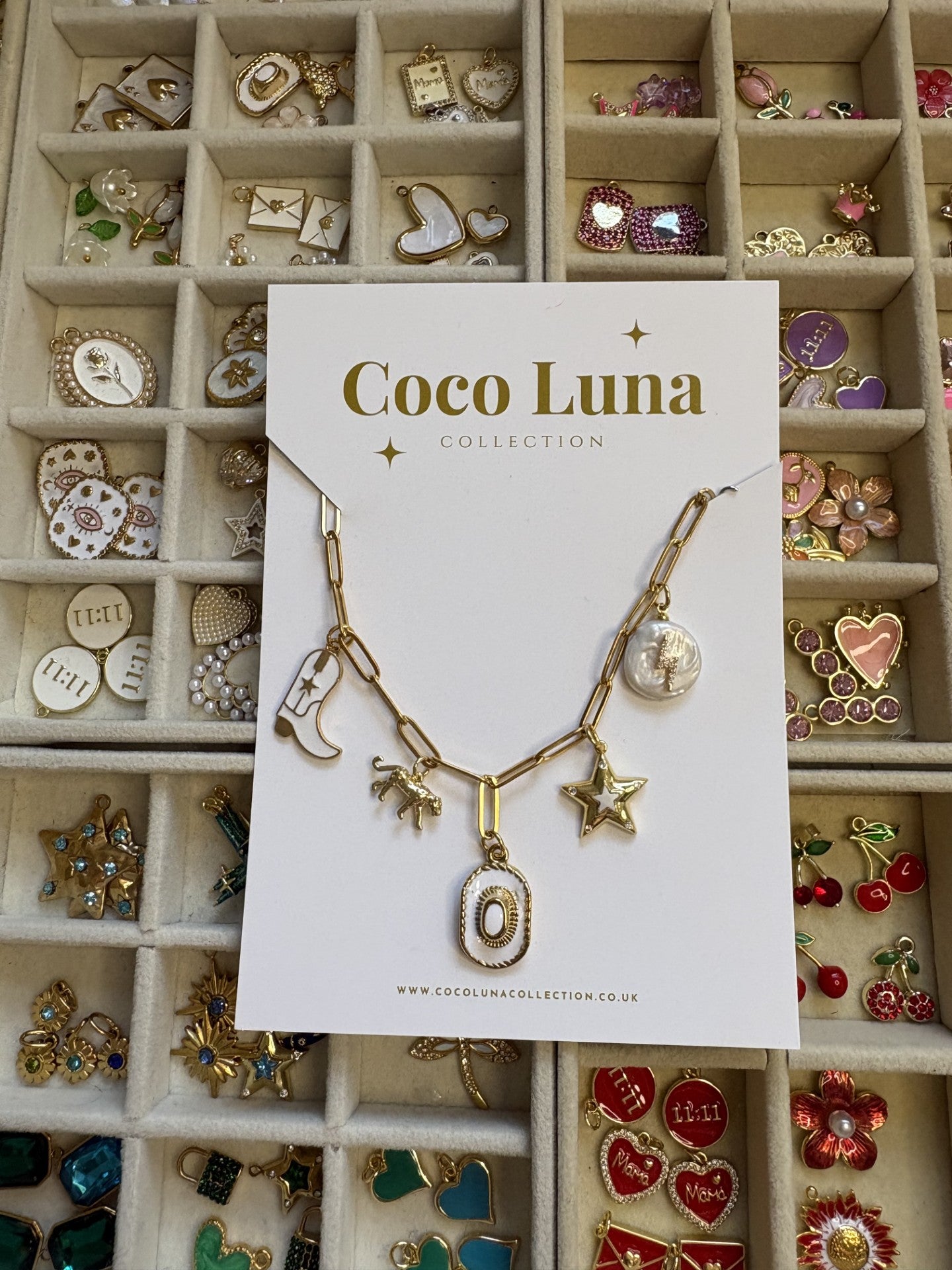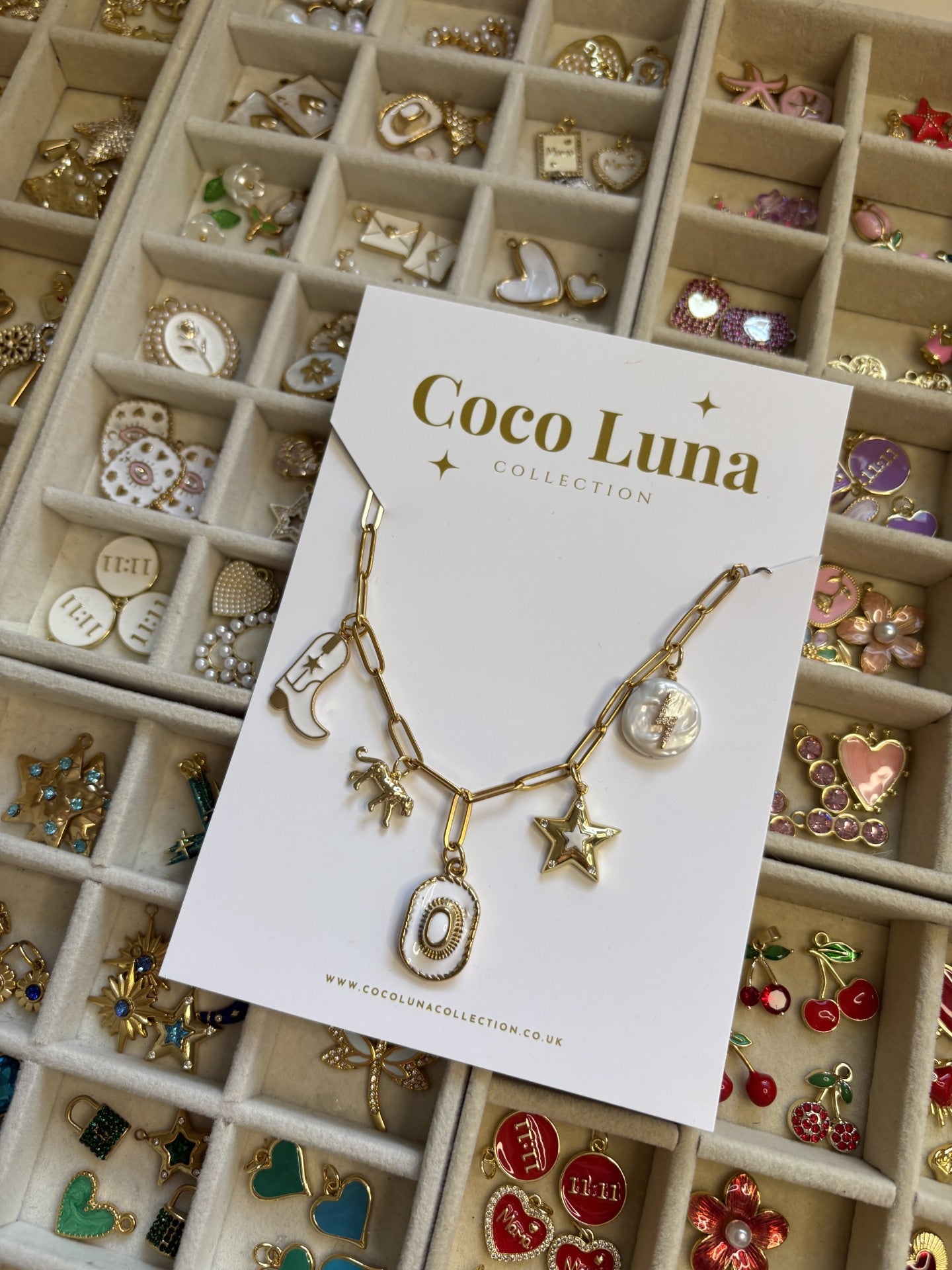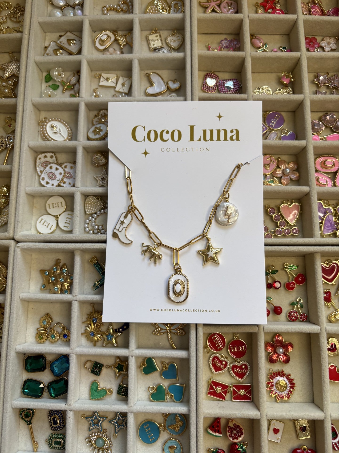 A collection of charm necklaces and bracelets ready to wear. These exclusive designs make choosing charms easy, especially when faced with over 500 options.