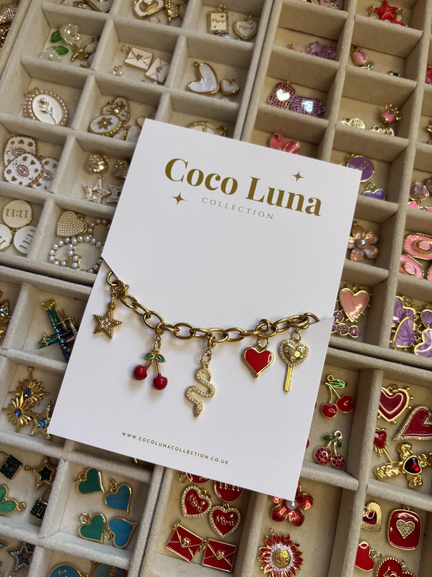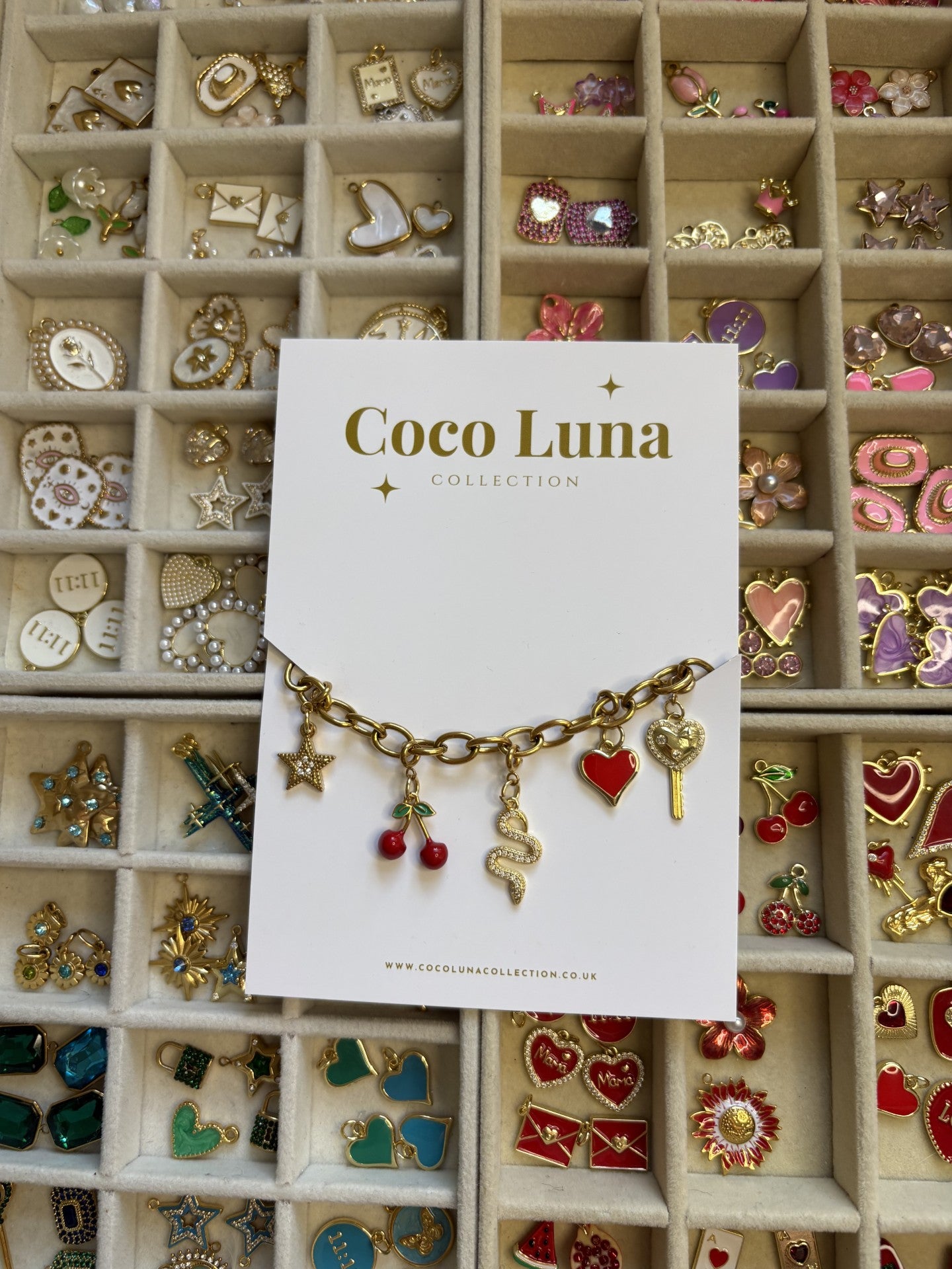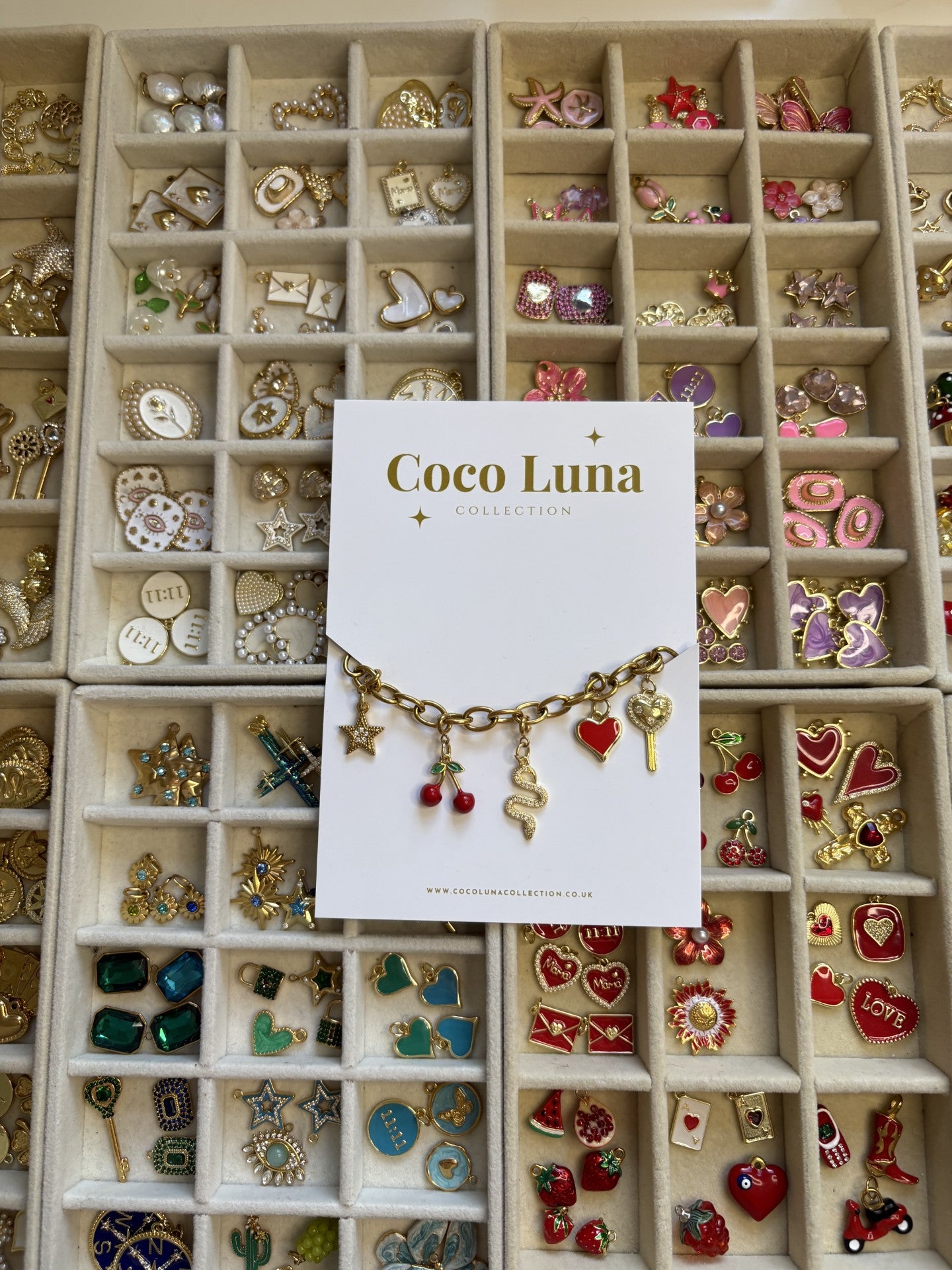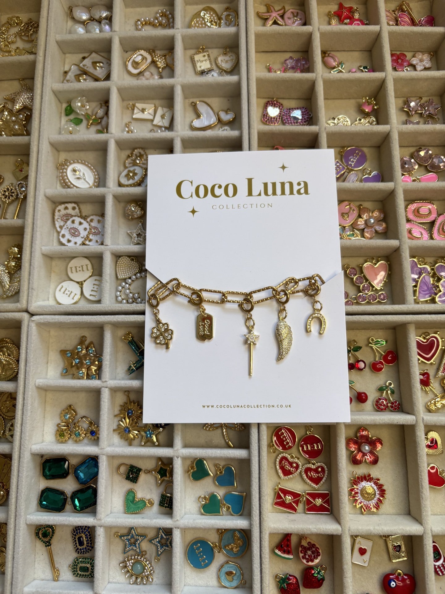 A collection of charm necklaces and bracelets ready to wear. These exclusive designs make choosing charms easy, especially when faced with over 500 options.